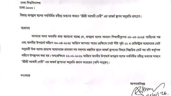 ঢাকা বিশ্ববিদ্যালয়ের জগন্নাথ হলের নবনির্মিত রবীন্দ্র ভবনের সামনে শ্রীশ্রী সরস্বতী দেবীর ভাস্কর্য স্থাপনের জন্য চূড়ান্ত প্রশাসনিক অনুমোদন প্রদান করা হয়েছে। ...বিস্তারিত পড়ুন