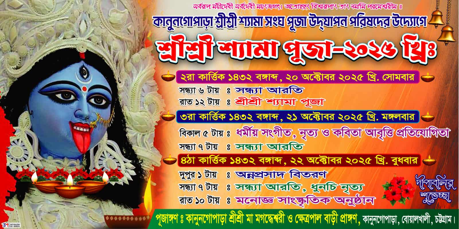 চট্টগ্রামের বোয়ালখালী উপজেলার কানুনগোপাড়া শ্রীশ্রী মা মঙ্গলচণ্ডী ও মণ্ডপাধ্য বাড়ি প্রাঙ্গণে আগামী ২০ অক্টোবর থেকে শুরু হচ্ছে তিনদিনব্যাপী শ্রীশ্রী শ্যামা পূজা ও উৎসব ২০২৫।