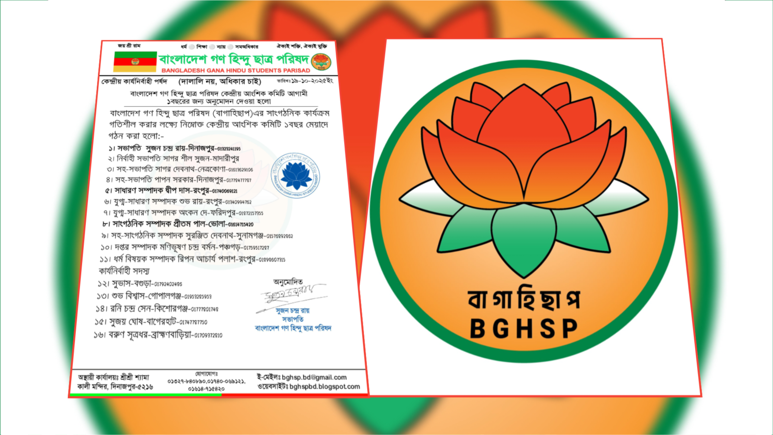 হিন্দু ছাত্র সমাজের অধিকার, মর্যাদা ও নৈতিক মূল্যবোধ প্রতিষ্ঠার অঙ্গীকারে কাজ করে আসা সংগঠন “বাংলাদেশ গণ হিন্দু ছাত্র পরিষদ” নতুন নেতৃত্ব ঘোষণা করেছে। আজ ১৯ অক্টোবর ২০২৫ ইংরেজি রোববার সংগঠনের সভাপতি সুজন চন্দ্র রায় আনুষ্ঠানিকভাবে সংগঠনের আংশিক কেন্দ্রীয় কমিটি ঘোষণা করেন।