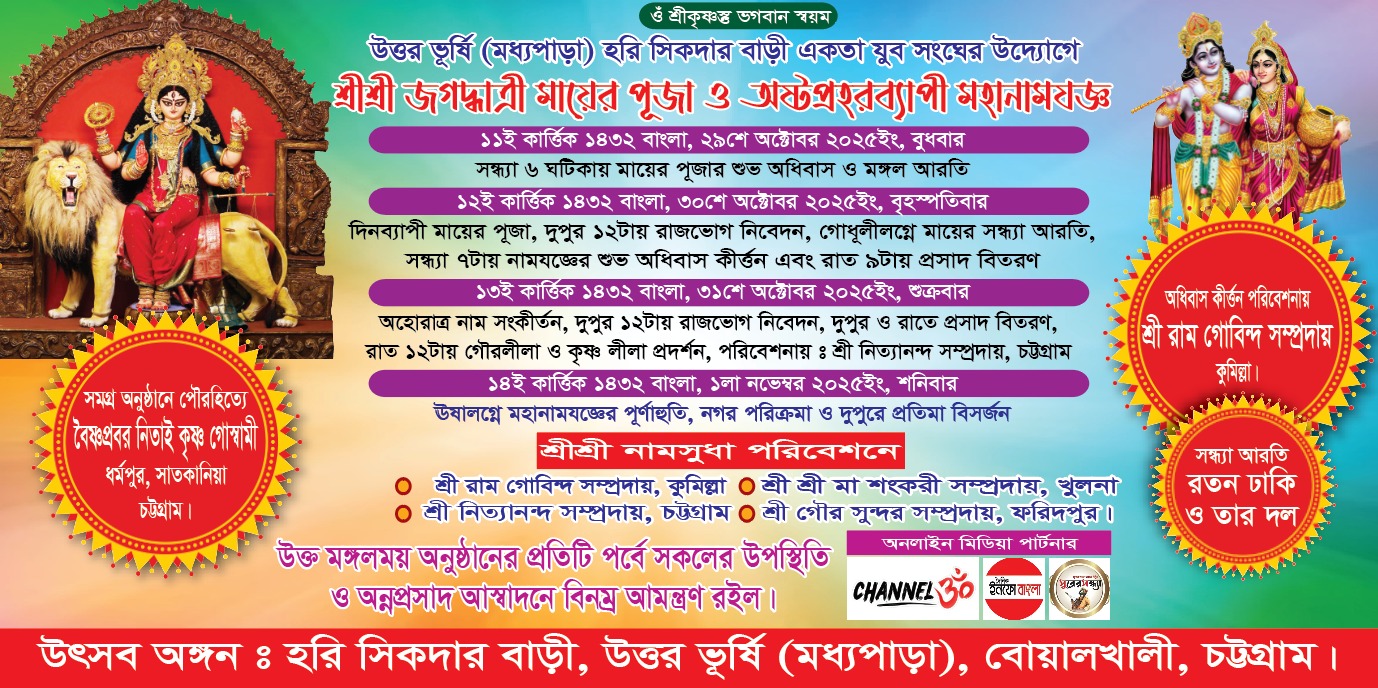 চট্টগ্রাম জেলার বোয়ালখালী উপজেলার উত্তর ভূর্ষি (মধ্যপাড়া) এলাকায় হরি সিকদার বাড়ি একতা যুব সংঘের উদ্যোগে প্রতি বছরের ন্যায় এবছরও যথাযোগ্য ধর্মীয় ভাবগাম্ভীর্য ও আনন্দ-উৎসবের মধ্য দিয়ে অনুষ্ঠিত হচ্ছে শ্রীশ্রী জগদ্ধাত্রী মায়ের পূজা ও অষ্টপ্রহরব্যাপী মহানামযজ্ঞ।