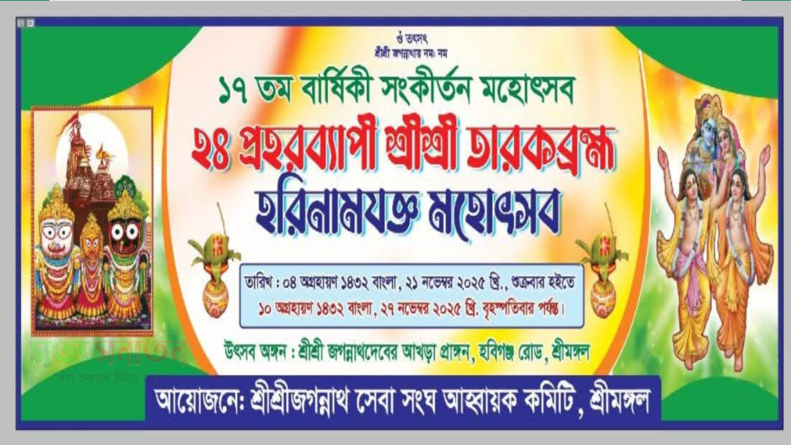 আগামী আসছে ২১ নভেম্বর শুক্রবার থেকে ২৭ নভেম্বর বৃহস্পতিবার পর্যন্ত (৪ অগ্রহায়ণ ১৪৩২ থেকে ১০ অগ্রহায়ণ ১৪৩২ বঙ্গাব্দ) শ্রীমঙ্গলের হবিগঞ্জ রোডে অবস্থিত শ্রীশ্রী জগন্নাথদেবের আখড়া প্রাঙ্গণে অনুষ্ঠিত হতে যাচ্ছে ১৭তম বার্ষিক হরিনাম ও ২৪ প্রহরব্যাপী শ্রীশ্রী সংকীর্তন মহোৎসব।