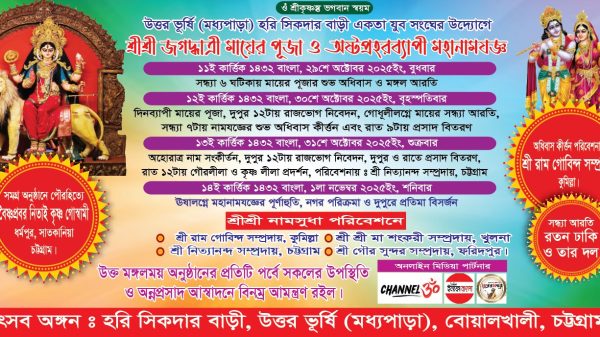 চট্টগ্রাম জেলার বোয়ালখালী উপজেলার উত্তর ভূর্ষি (মধ্যপাড়া) এলাকায় হরি সিকদার বাড়ি একতা যুব সংঘের উদ্যোগে প্রতি বছরের ন্যায় এবছরও যথাযোগ্য ধর্মীয় ভাবগাম্ভীর্য ও আনন্দ-উৎসবের মধ্য দিয়ে অনুষ্ঠিত হচ্ছে শ্রীশ্রী ...বিস্তারিত পড়ুন