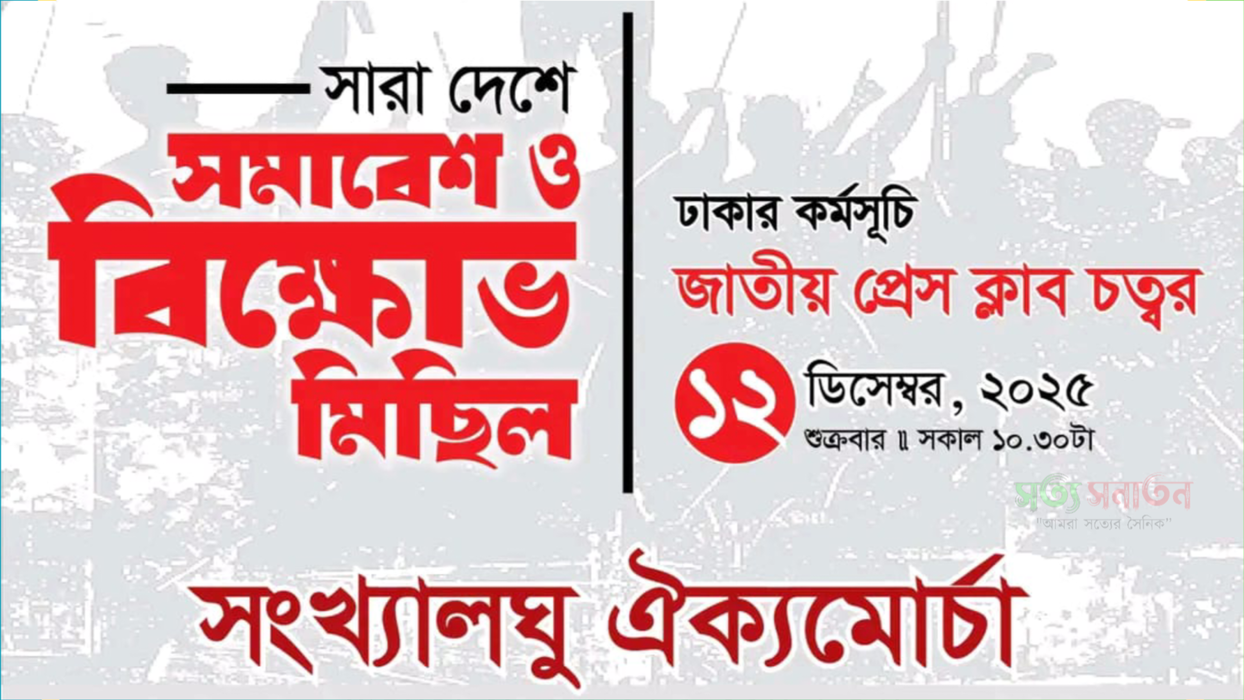 ঢাকায় কেন্দ্রীয় কর্মসূচির অংশ হিসেবে জাতীয় প্রেস ক্লাব চত্বরে সমাবেশ ও বিক্ষোভ মিছিল হবে। আয়োজকদের ভাষ্য, সাম্প্রতিক ঘটনাপ্রবাহে জনগণের মধ্যে যে উদ্বেগ তৈরি হয়েছে, সেটি তুলে ধরতেই এই উদ্যোগ। "সত্য সনাতন টিভি"