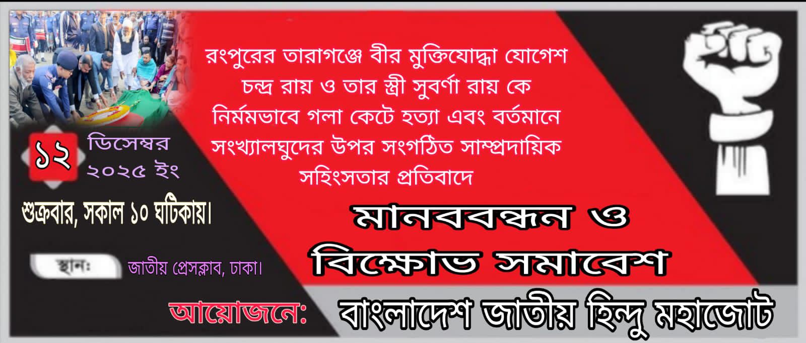 রংপুরের তারাগঞ্জে বীর মুক্তিযোদ্ধা যোগেশ রায় ও তাঁর স্ত্রী সুবর্ণা রায়, মৎস্যব্যবসায়ী উৎপল সরকার এবং স্বর্ণ ব্যবসায়ী প্রাণোতোষ কর্মকারকে নৃশংসভাবে হত্যার ঘটনার পর দেশজুড়ে সংখ্যালঘু হিন্দু সম্প্রদায়ের ওপর নির্যাতন, জমি দখল ও মন্দির ভাঙচুরের প্রতিবাদে মানববন্ধন কর্মসূচি ঘোষণা করেছে বাংলাদেশ জাতীয় হিন্দু মহাজোট।