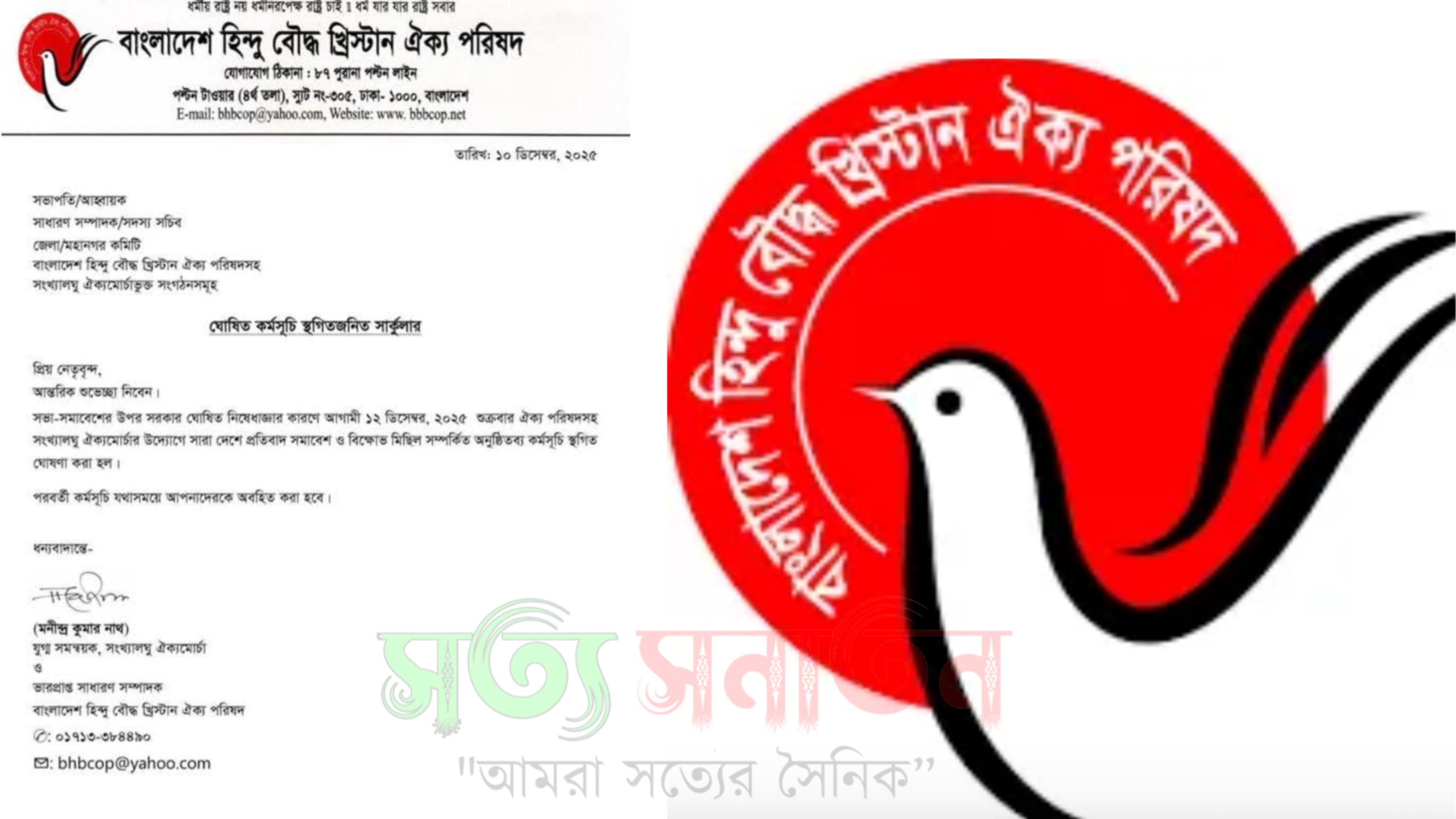 সভা–সমাবেশের ওপর সরকারের ঘোষিত নিষেধাজ্ঞার কারণে আগামী ১২ ডিসেম্বরের সব কর্মসূচি স্থগিত করেছে বাংলাদেশ হিন্দু বৌদ্ধ খ্রিস্টান ঐক্য পরিষদ। সংগঠনের কেন্দ্রীয় দপ্তর থেকে আজ এক বিজ্ঞপ্তিতে এ তথ্য জানানো হয়। "সত্য সনাতন টিভি"