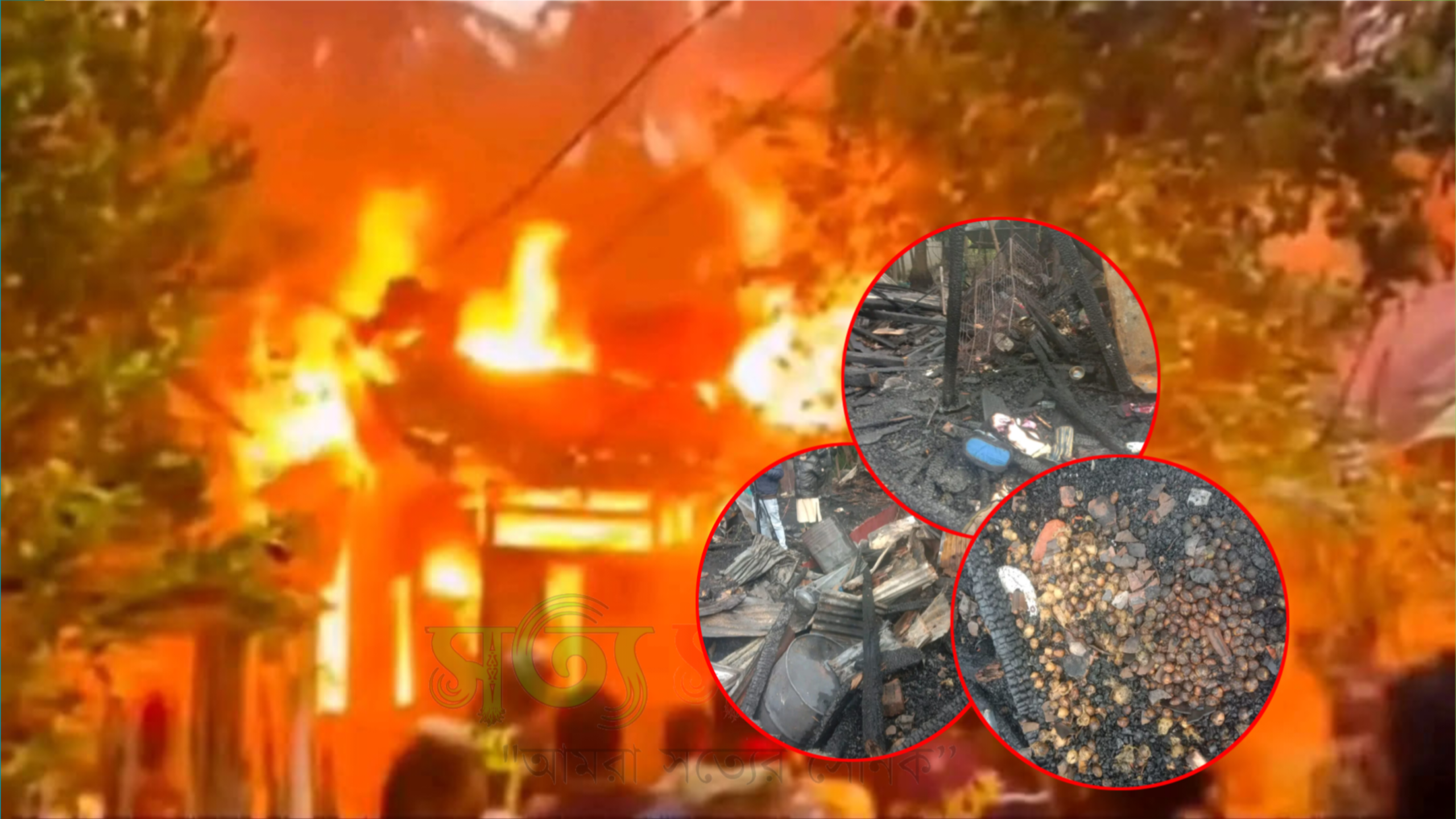 ক্ষতিগ্রস্ত পরিবারের সদস্য সন্ধ্যা রানী সাহা জানান, ভোররাতে অজ্ঞাত দুর্বৃত্তরা পলাশ সাহার খাবার ঘরের জানালা দিয়ে কিছু কাপড় ঢুকিয়ে আগুন ধরিয়ে দেয়। মুহূর্তের মধ্যেই আগুন দ্রুত ছড়িয়ে পড়ে এবং একের পর এক ঘর গ্রাস করে নেয়। ঘুমন্ত অবস্থায় পরিবারের সদস্যরা আতঙ্কে ছোটাছুটি করে কোনো রকমে প্রাণে রক্ষা পান। "সত্য সনাতন টিভি"
