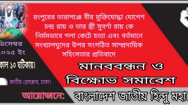 রংপুরের তারাগঞ্জে বীর মুক্তিযোদ্ধা যোগেশ রায় ও তাঁর স্ত্রী সুবর্ণা রায়, মৎস্যব্যবসায়ী উৎপল সরকার এবং স্বর্ণ ব্যবসায়ী প্রাণোতোষ কর্মকারকে নৃশংসভাবে হত্যার ঘটনার পর দেশজুড়ে সংখ্যালঘু হিন্দু সম্প্রদায়ের ওপর নির্যাতন, জমি ...বিস্তারিত পড়ুন