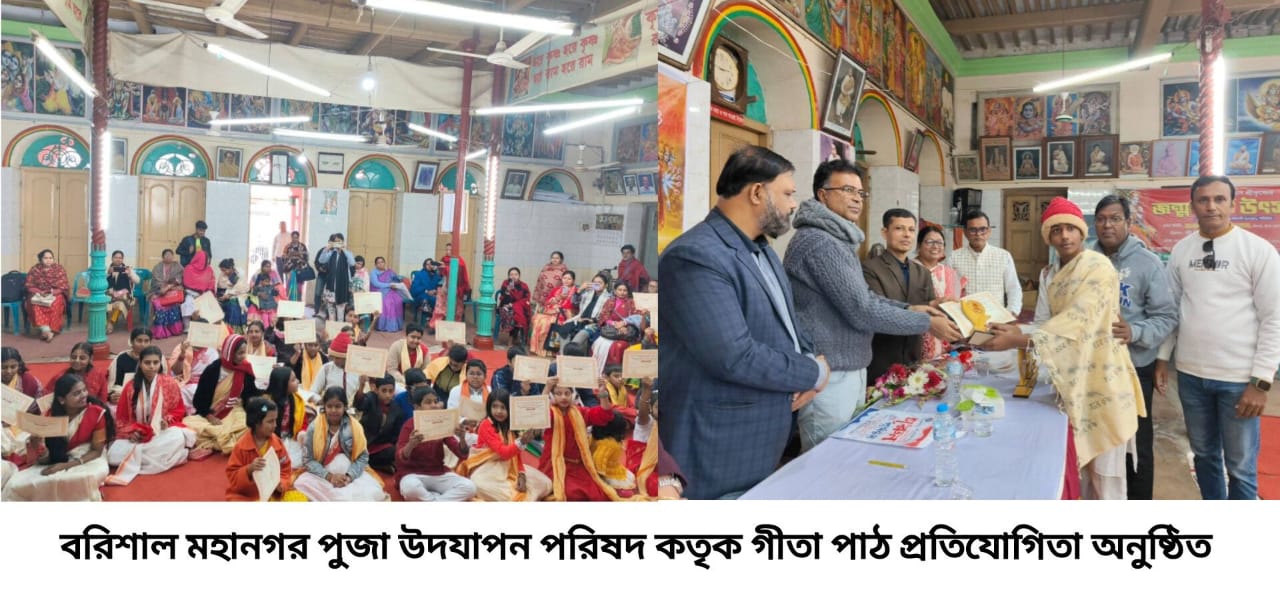 দেশব্যাপী শুরু হয়েছে বাংলাদেশ পূজা উদযাপন পরিষদ, কেন্দ্রীয় কমিটি আয়োজিত জাতীয় পর্যায়ে শ্রীমদ্ভগবত গীতা পাঠ প্রতিযোগিতা-২০২৫। তারই ধারাবাহিকতায় ০২ জানুয়ারি শুক্রবার বরিশাল মহানগর পর্যায়ে গীতাপাঠ প্রতিযোগিতা অনুষ্ঠিত হয়েছে।