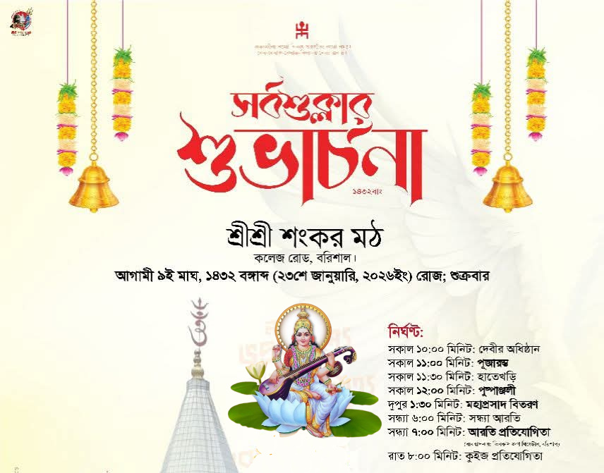 বরিশালের প্রানকেন্দ্রে অবস্থিত ঐতিহ্যবাহী শ্রী শ্রী শংকর মঠ মন্দিরে অত্যন্ত ভাবগাম্ভীর্য ও উৎসবমুখর পরিবেশে অনুষ্ঠিত হতে যাচ্ছে সনাতন ধর্মাবলম্বীদের অন্যতম প্রধান ধর্মীয় উৎসব শ্রী শ্রী সরস্বতী পূজা। এ বছর প্রতিষ্ঠানটি ‘বাণী অর্চনা ১৪৩২’ বঙ্গাব্দ উপলক্ষে ইতোমধ্যেই যাবতীয় প্রস্তুতি সম্পন্ন করেছে শংকর মঠের কতৃপক্ষ।