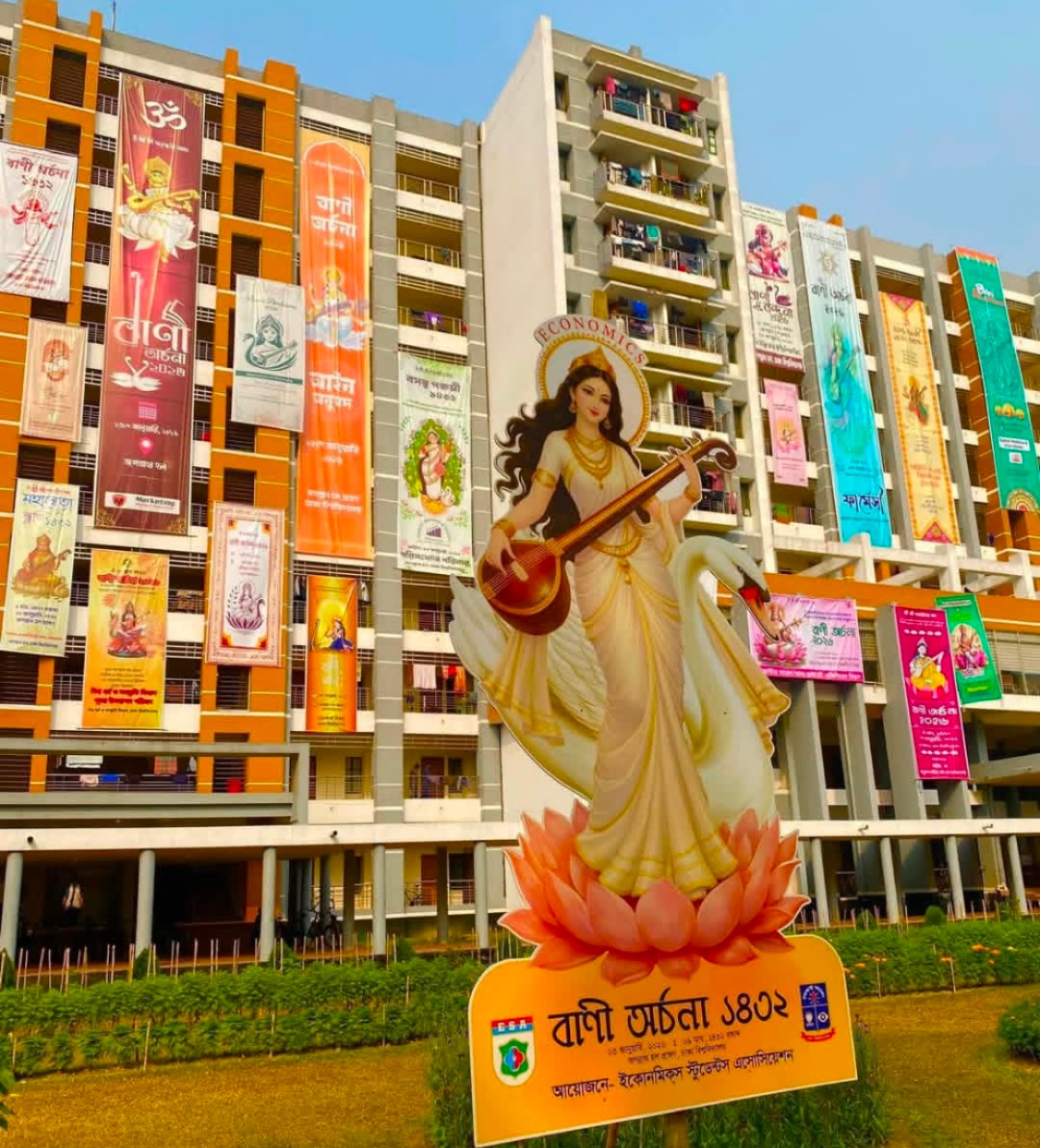 ঢাকা বিশ্ববিদ্যালয়ের জগন্নাথ হলের মাঠে শুরু হয়েছে সনাতন ধর্মাবলম্বী শিক্ষার্থীদের উচ্ছ্বাসময় সরস্বতী পূজা প্রস্তুতি। মাঘ মাসের শ্রী পঞ্চমী তিথিতে এই পূজা অনুষ্ঠিত হয়, যা ঢাকায় বসবাসরত সনাতন ধর্মাবলম্বীদের জন্য এক আনন্দ ও মিলনের দিন।
