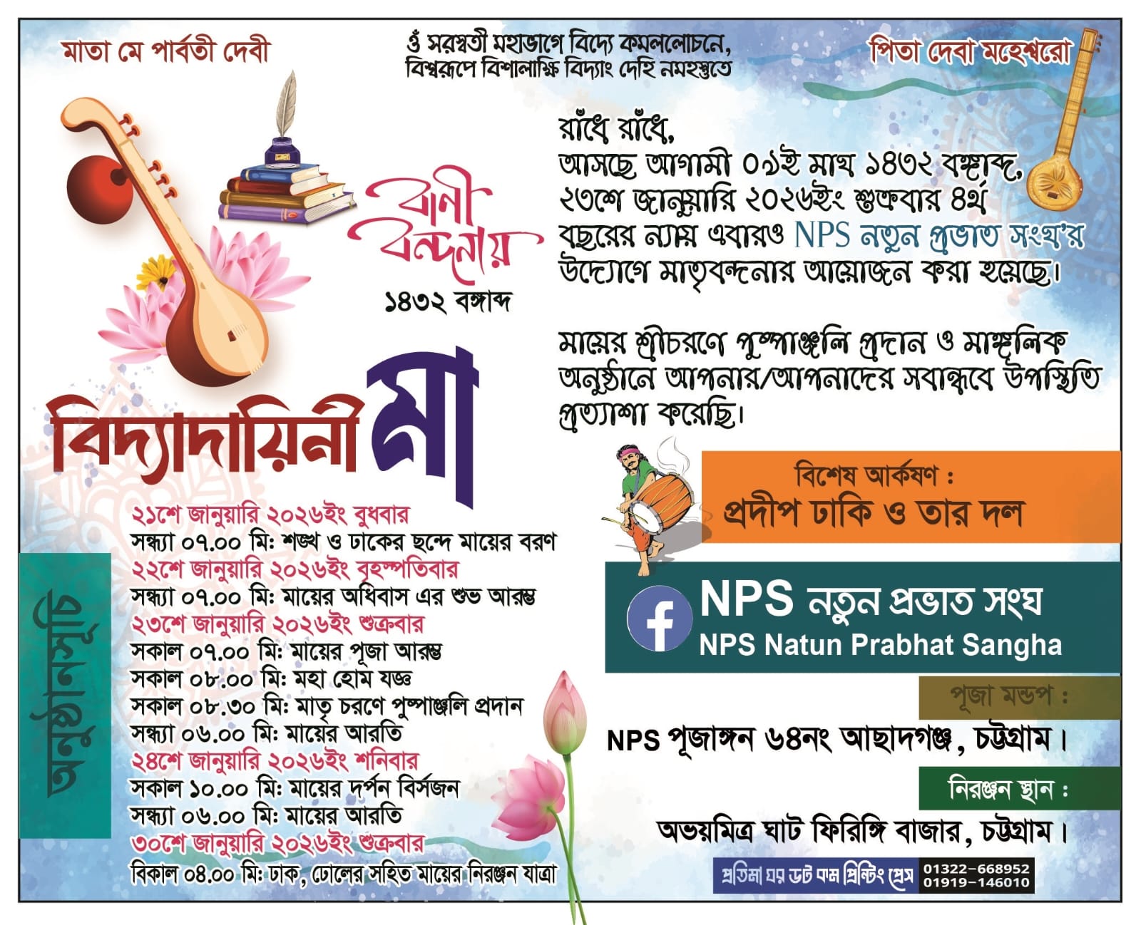 চট্টগ্রামের ৬৪নং আছাদগঞ্জে অবস্থিত NPS (নতুন প্রভাত সংঘ) এর আয়োজনে এবার ৪র্থ বর্ষে অনুষ্ঠিত হতে যাচ্ছে শ্রীশ্রী সরস্বতী পূজা ১৪৩২ বঙ্গাব্দ। এবারের আয়োজনে পূজার মূল ভাবনা নির্ধারণ করা হয়েছে “বিদ্যাদায়িনী মা”, যিনি জ্ঞান, বুদ্ধি, শিক্ষা ও সংস্কৃতির অধিষ্ঠাত্রী দেবী।