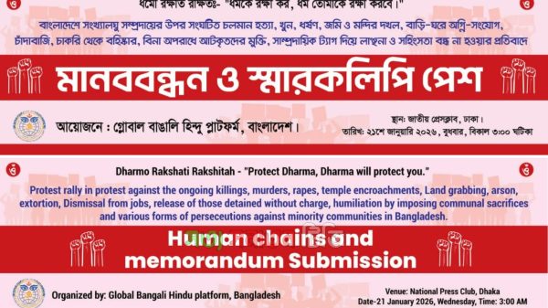 বাংলাদেশে সংখ্যালঘু সম্প্রদায়ের ওপর চলমান নির্যাতন, সহিংসতা ও বৈষম্যের প্রতিবাদে মানববন্ধন এর ঘোষণা দেওয়া হয়েছে। ‘ধর্ম রক্ষতি রক্ষিত ধর্মকে রক্ষা কর, ধর্ম তোমাকে রক্ষা করবে’ এই মূল প্রতিপাদ্যকে সামনে রেখে ...বিস্তারিত পড়ুন