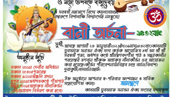 বিদ্যা, জ্ঞান ও সঙ্গীতের অধিষ্ঠাত্রী দেবী শ্রী শ্রী সরস্বতীর আরাধনায় লালমনিরহাট জেলার কালমাটি এলাকায় আগামী ২৩ জানুয়ারি ২০২৬ খ্রিস্টাব্দে অনুষ্ঠিত হতে যাচ্ছে ৪র্থ তম শ্রী শ্রী সরস্বতী পূজা। এ উপলক্ষে ...বিস্তারিত পড়ুন