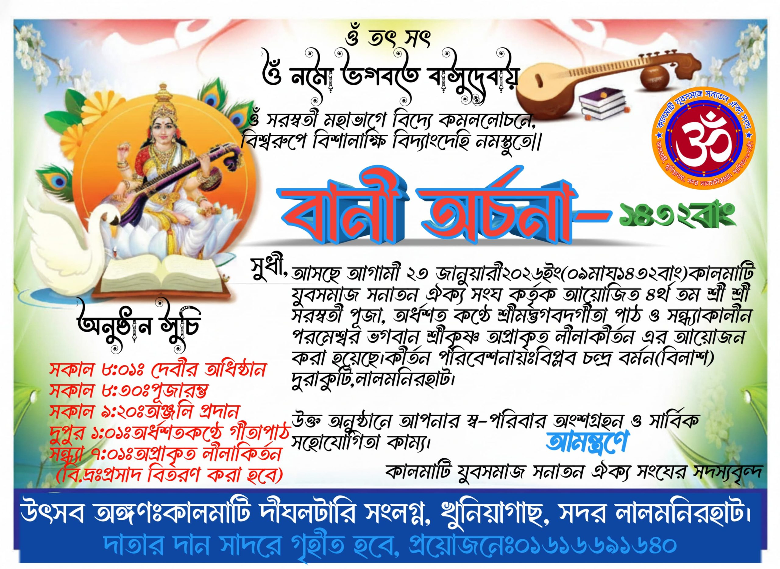 বিদ্যা, জ্ঞান ও সঙ্গীতের অধিষ্ঠাত্রী দেবী শ্রী শ্রী সরস্বতীর আরাধনায় লালমনিরহাট জেলার কালমাটি এলাকায় আগামী ২৩ জানুয়ারি ২০২৬ খ্রিস্টাব্দে অনুষ্ঠিত হতে যাচ্ছে ৪র্থ তম শ্রী শ্রী সরস্বতী পূজা। এ উপলক্ষে দিনব্যাপী ধর্মীয় ও সাংস্কৃতিক আয়োজন করেছে কালমাটি যুবসমাজ সনাতন ঐক্য সংঘ।