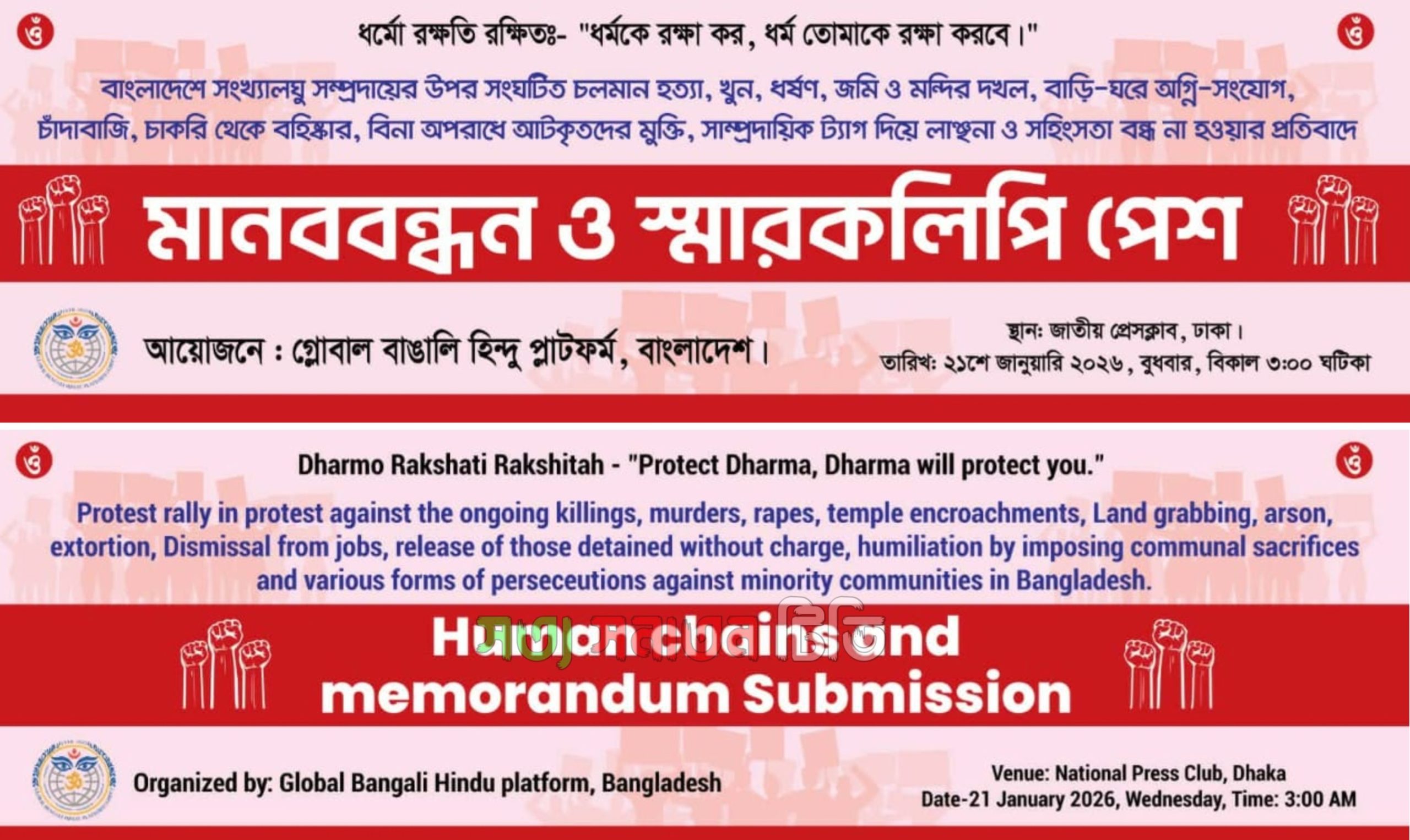বাংলাদেশে সংখ্যালঘু সম্প্রদায়ের ওপর চলমান নির্যাতন, সহিংসতা ও বৈষম্যের প্রতিবাদে মানববন্ধন এর ঘোষণা দেওয়া হয়েছে। ‘ধর্ম রক্ষতি রক্ষিত ধর্মকে রক্ষা কর, ধর্ম তোমাকে রক্ষা করবে’ এই মূল প্রতিপাদ্যকে সামনে রেখে কর্মসূচির আয়োজন করেছে গ্লোবাল বাঙালি হিন্দু প্ল্যাটফর্ম, বাংলাদেশ।