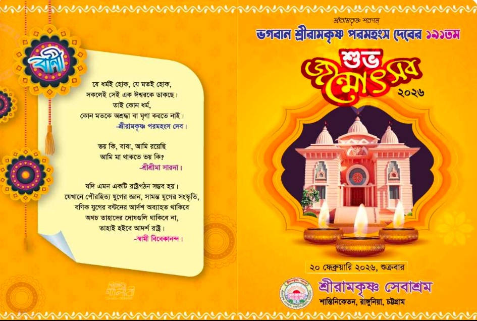 সব মিলিয়ে, ভক্তি, জ্ঞান ও সেবার সমন্বয়ে আয়োজিত এই জন্মোৎসব রাঙ্গুনিয়ার ধর্মপ্রাণ মানুষের জন্য হয়ে উঠবে এক অনন্য আধ্যাত্মিক মিলনমেলা।চট্টগ্রামের রাঙ্গুনিয়ায় অবস্থিত শ্রীরামকৃষ্ণ সেবাশ্রমে ভক্তি, শ্রদ্ধা ও ধর্মীয় ভাবগাম্ভীর্যের মধ্য দিয়ে উদযাপিত হতে যাচ্ছে বিশ্ববরেণ্য সাধক শ্রী রামকৃষ্ণ পরমহংস–এর ১৯১তম শুভ জন্মোৎসব। আগামী ২০ ফেব্রুয়ারি ২০২৬, শুক্রবার দিনব্যাপী নানা ধর্মীয় আচার-অনুষ্ঠান, পাঠ, আলোচনা ও সাংস্কৃতিক পরিবেশনার মাধ্যমে আয়োজিত হবে এ মহতী অনুষ্ঠান।