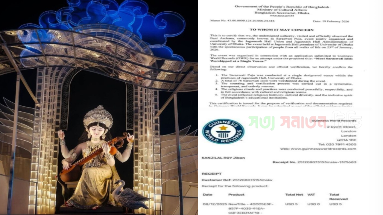 University of Dhaka-এর জগন্নাথ হলে আয়োজিত বাণী অর্চনা তথা সরস্বতী পূজাকে ঘিরে বিশ্বরেকর্ড গড়ার প্রচেষ্টায় নতুন অগ্রগতি এসেছে। “একটি একক স্থানে সর্বাধিক সংখ্যক সরস্বতী প্রতিমা পূজা” শিরোনামে Guinness World Records-এ আবেদনের অংশ হিসেবে আয়োজকদের হাতে প্রত্যয়নপত্র তুলে দিয়েছে সংস্কৃতি বিষয়ক মন্ত্রণালয়।