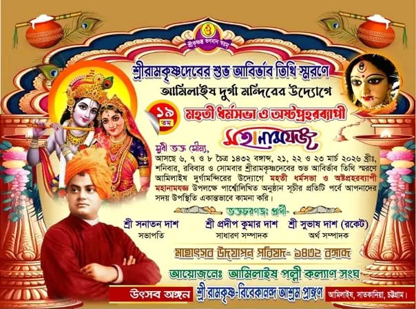 চট্টগ্রামের সাতকানিয়া উপজেলার আমিলাইশ গ্রামে শ্রীশ্রী রামকৃষ্ণদেবের শুভ আবির্ভাব তিথি উপলক্ষে ১৯তম বর্ষব্যাপী মহোৎসব, মহতী ধর্মসভা ও অষ্টপ্রহরব্যাপী মহানামযজ্ঞের আয়োজন করা হয়েছে। আগামী ২১, ২২ ও ২৩ মার্চ ২০২৬ খ্রিস্টাব্দ (৬, ৭ ও ৮ চৈত্র ১৪৩২ বঙ্গাব্দ) তিন দিনব্যাপী এই ধর্মীয় অনুষ্ঠান অনুষ্ঠিত হবে।