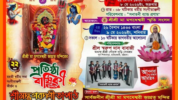 চট্টগ্রামের ঐতিহ্যবাহী এনায়েতপুর এলাকার কুমারীকুল রাস্তার মাথায় অবস্থিত শ্রী শ্রী মা মগদেশ্বরী জাগ্রত মন্দিরের ২২তম প্রতিষ্ঠা বার্ষিকী উপলক্ষে আগামী ২৫ ও ২৬ বৈশাখ ১৪৩৩ বাংলা (৮ ও ৯ মে ২০২৬ খ্রিস্টাব্দ), শুক্রবার ও শনিবার দুই দিনব্যাপী এক মহতি ধর্মীয় অনুষ্ঠানের আয়োজন করা হয়েছে। অনুষ্ঠানটি সুষ্ঠুভাবে সম্পন্ন করার লক্ষ্যে ব্যাপক প্রস্তুতি গ্রহণ করেছে আয়োজক সংগঠন শ্রী শ্রী মা মগদেশ্বরী স্মৃতি সংসদ।