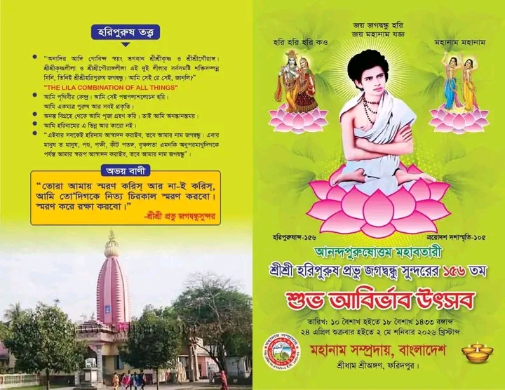 প্রভু জগৎবন্ধু সুন্দরের ১৫৬ তম জন্মতিথি উপলক্ষে ফরিদপুরে ৯ দিনব্যাপী মহানাম মহাযজ্ঞ ও ধর্মীয় উৎসব