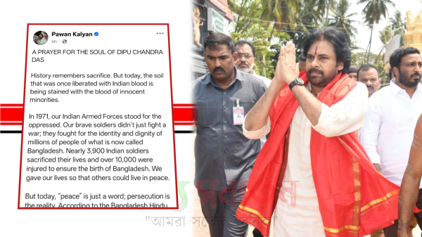 ময়মনসিংহে সংখ্যালঘু যুবক দীপু চন্দ্র দাসের নৃশংস হত্যাকাণ্ডে গভীর শোক ও ক্ষোভ প্রকাশ করেছেন ভারতের অন্ধ্রপ্রদেশের উপ-মুখ্যমন্ত্রী ও জনসেনা পার্টির প্রধান পবন কল্যাণ। এক আবেগঘন সামাজিক যোগাযোগমাধ্যম পোস্টে তিনি দীপু